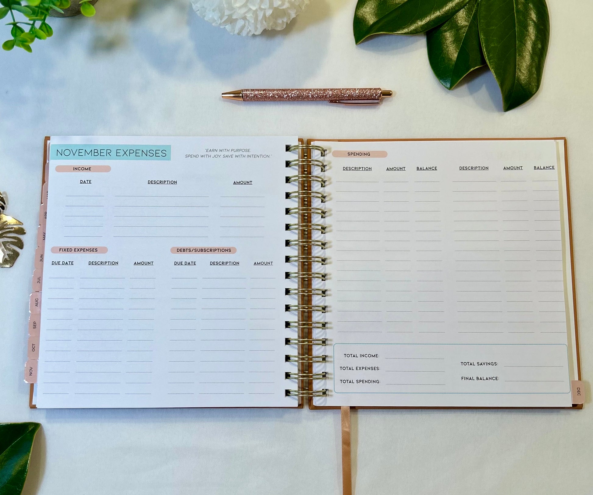 All-in-One Layout: Monthly and weekly pages thoughtfully structured to capture your schedule, habits, finances, and reflections.